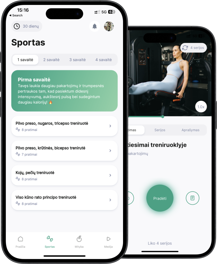 Tol, kol turėsi aktyvią narystę, galėsi aktyvuoti bet kurį iš mūsų specialistų paruoštų planų. Kiekvienas planas susideda iš 4 savaičių sporto programos bei 4 savaičių mitybos plano. Tinkamiausią planą išsirinkti padės išmani mobilioji programėlė. 🫶